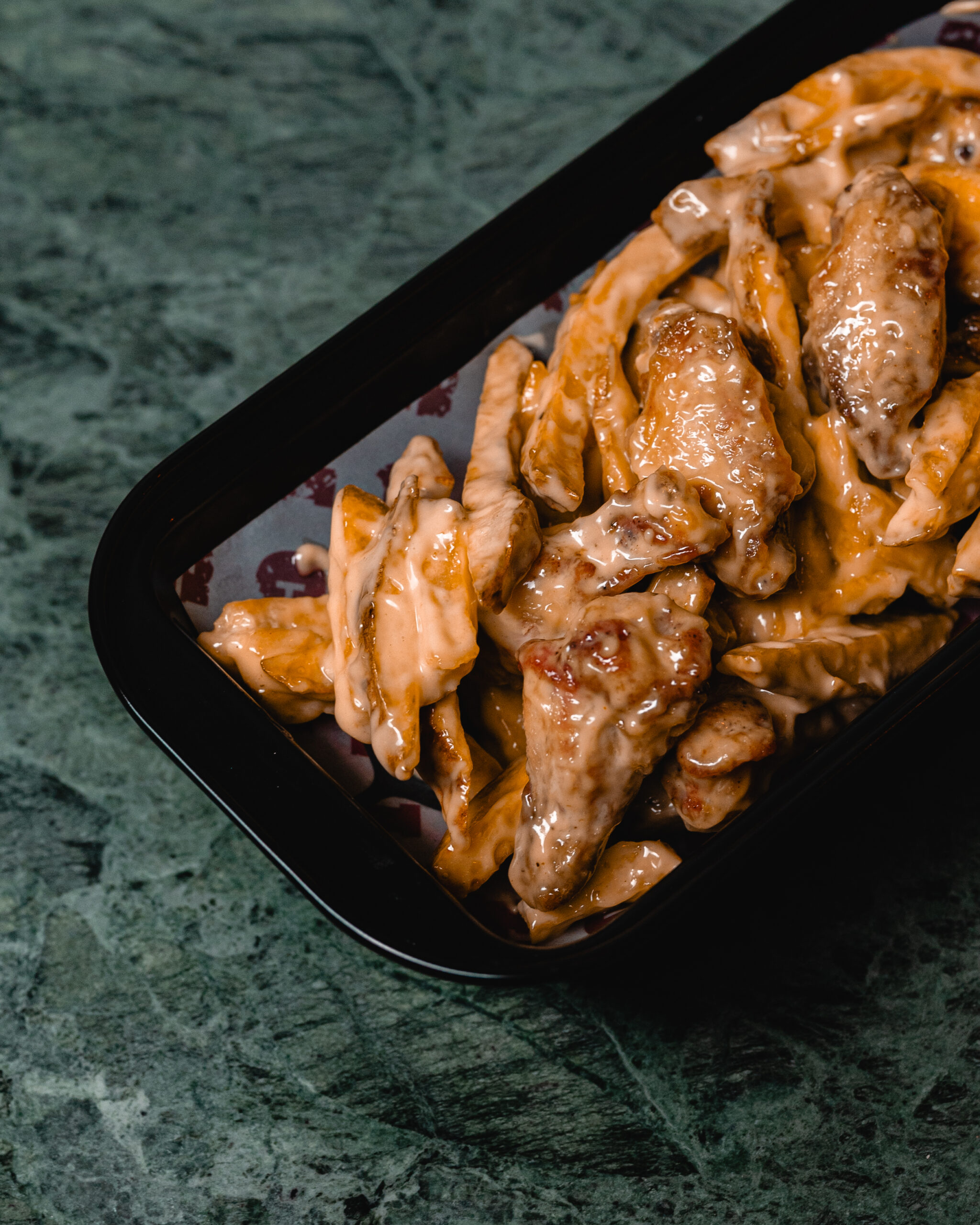 Fried chicken wings with fried fries, toss with choice of dressing ranch, honey mustard, spicy